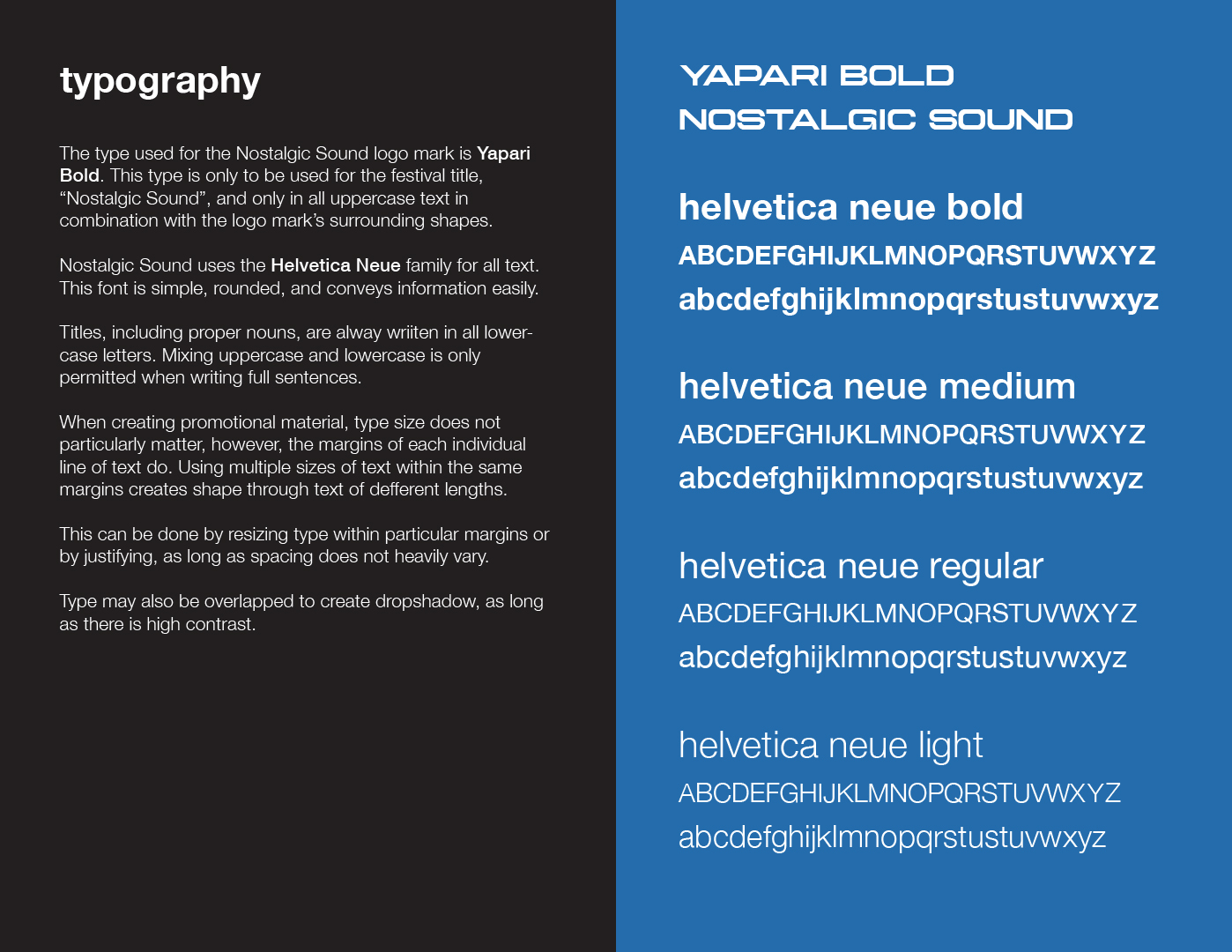 • Typography choice, featuring Yapari Bold and Helvetica Neue.